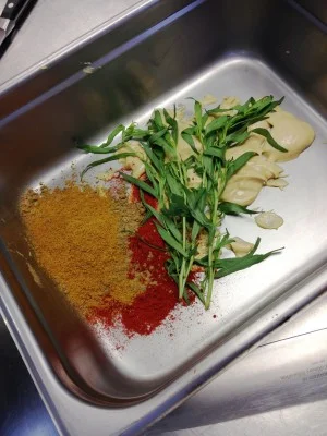 Layers of flavor: ground cumin, paprika, tarragon, mustard