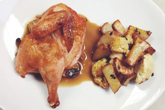 A “market basket” trial run: half poussin with roasted potatoes, cauliflower, porcini ragout and pan sauce
