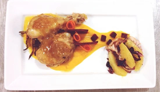 My “market basket” exam: braised chicken with orange/squash puree, roasted and raw beets, carrot ribbons, stewed radicchio, pan sauce.